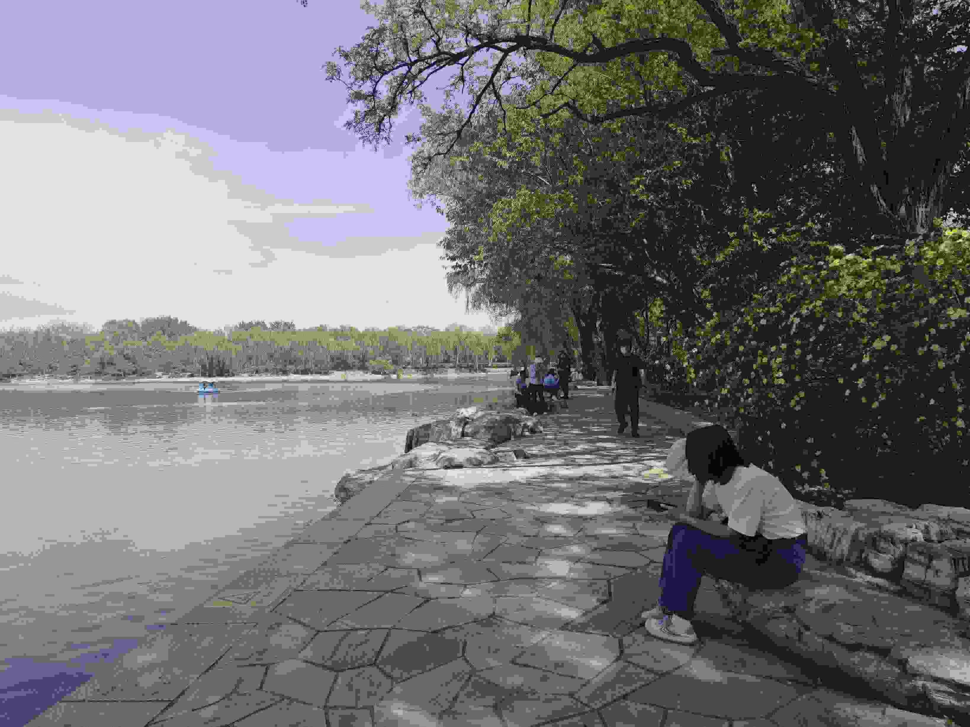 工作日午休時分的玉淵潭公園,也成了上班族的精神“快充站”。玉淵潭公園東湖旁,一排年輕人正悠閑地曬著太陽。眼前的湖面開闊平靜,微風(fēng)拂面,頭頂垂柳依依,耳邊不時傳來清脆的鳥鳴聲。