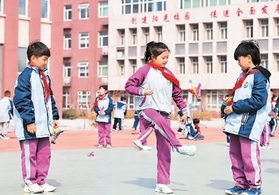 河北省邢臺市廣宗縣第四小學(xué)學(xué)生在課間踢毽子。王 壘攝(人民視覺)