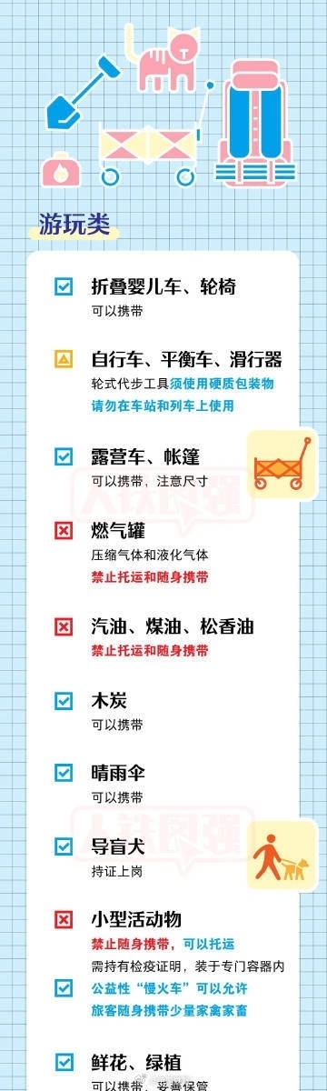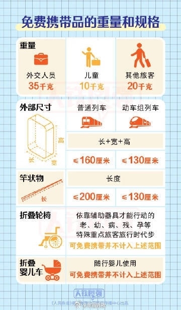 坐火車出游的小伙伴請注意!有些物品過不了安檢,出發(fā)前趕快篩查行李單,隨手轉(zhuǎn)發(fā)!①包裝密封完好、標(biāo)志清晰且酒精體積百分含量大于或者等于24%、小于或者等于70%的酒類飲品累計不超過3000毫升。②充電寶標(biāo)志清晰,單塊額定能量不超過100Wh。③自噴壓力容器,單體容器容積不超過150毫升,每種限帶1件,累計不超過600毫升。④含易燃成分的非自噴壓力容器日用品,單體容器容積不超過100毫升,每種限帶1件。