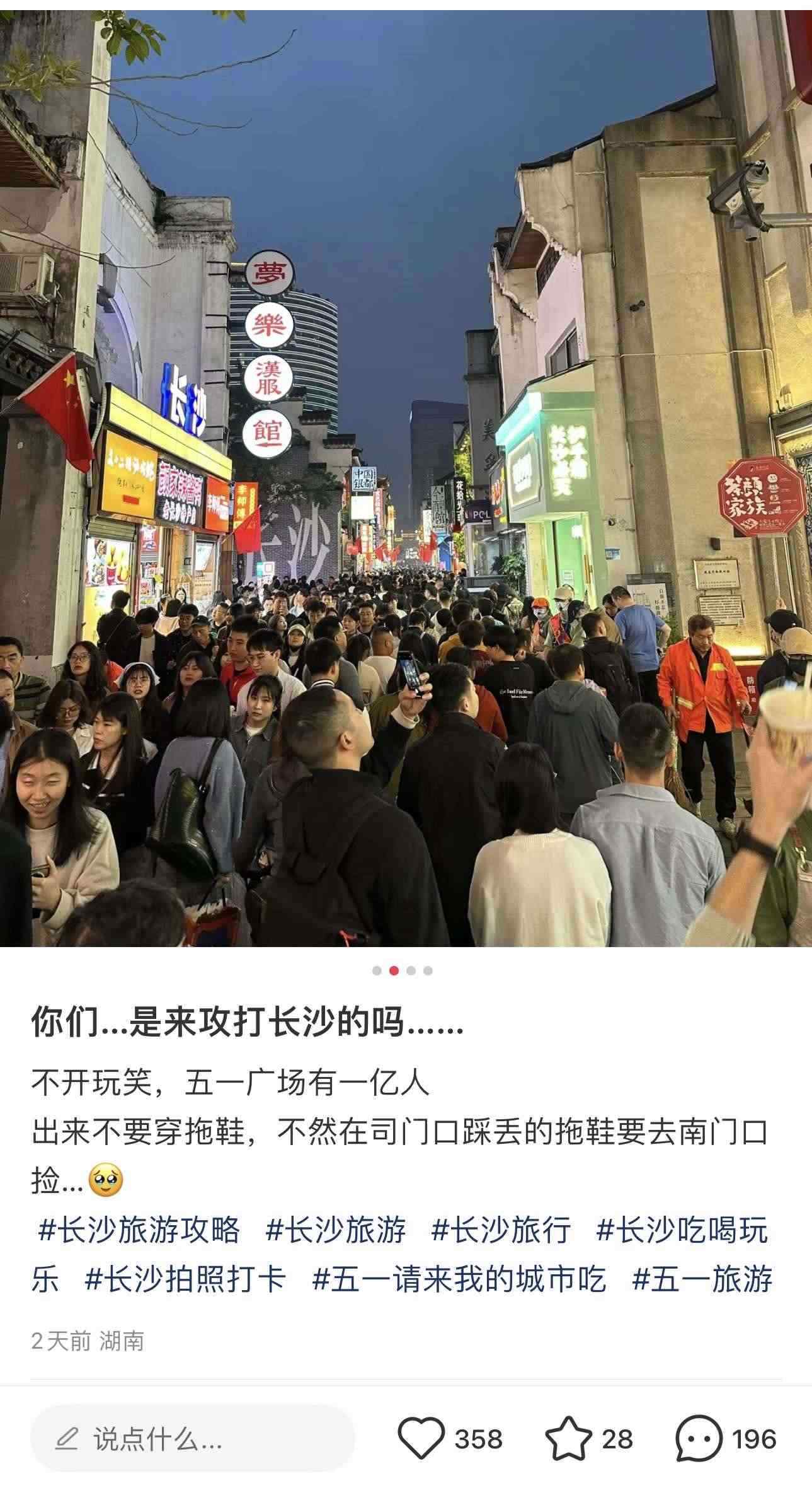 還有長沙的網(wǎng)友表示:“小小的一條路硬是擠了十多分鐘才出來……本長沙土著已經(jīng)回鄉(xiāng)避人群了,把長沙留給你們玩!”