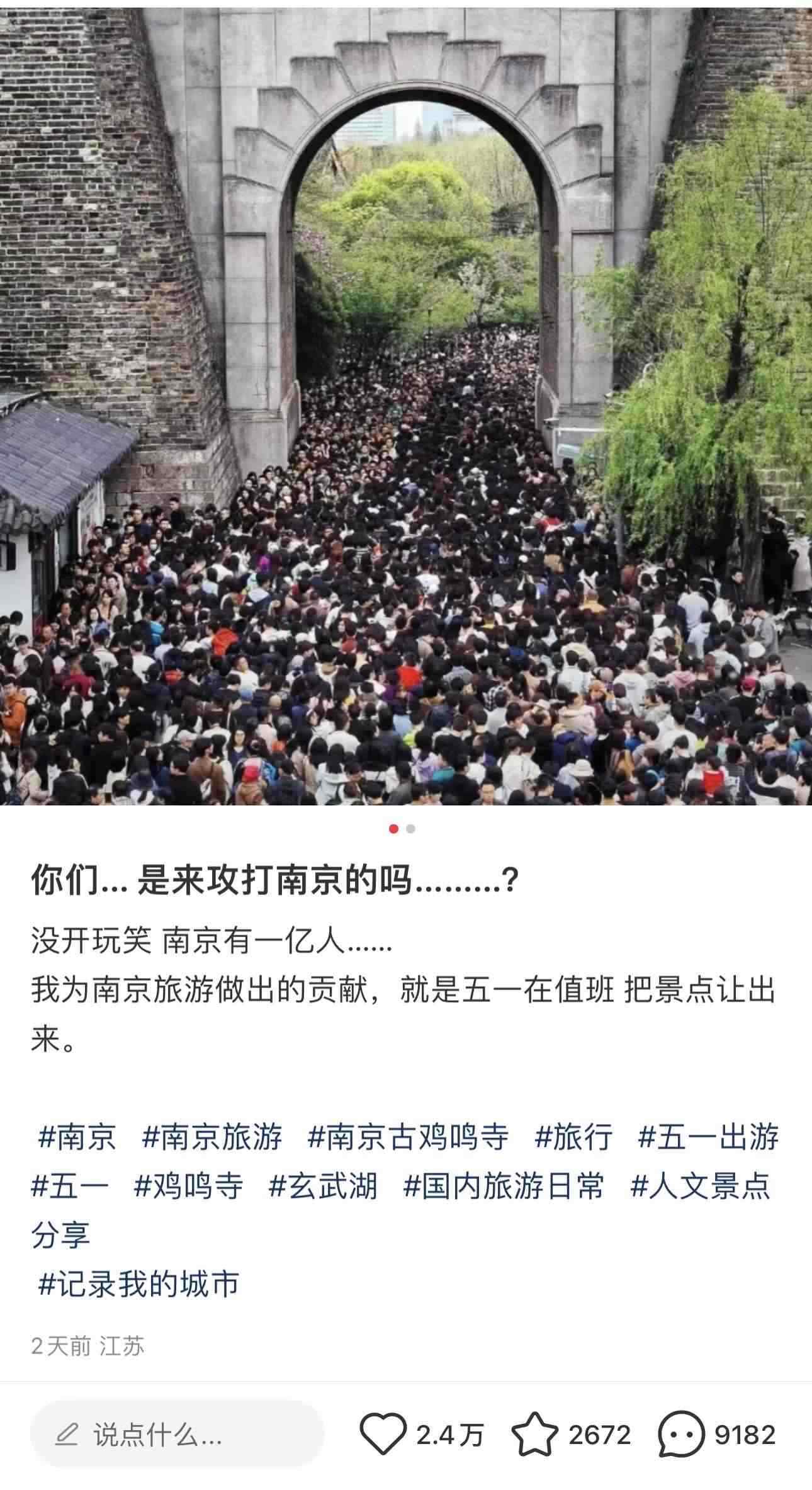 某定位顯示南京的網(wǎng)友表示:“我為南京旅游作出的貢獻(xiàn),就是五一在值班,把景點(diǎn)讓出來?!?/p>