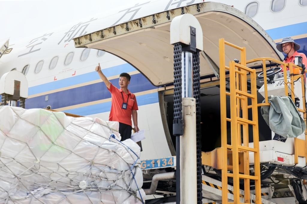 2024年“五一”期間,廣州白云機(jī)場,南航裝卸員侯華偉與同事一起裝載航班行李和貨物。(南航供圖)