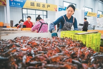 近日,工作人員在湖北省潛江市中國(guó)小龍蝦交易中心分揀小龍蝦。新華社記者 伍志尊攝