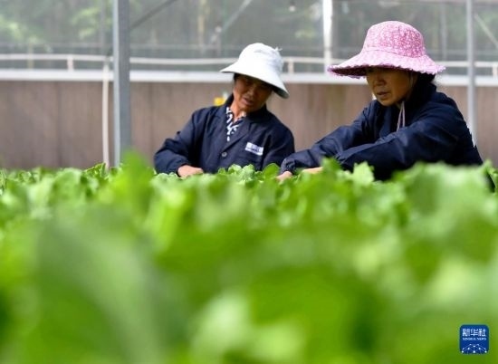 5月15日,工作人員在福州市長樂區(qū)雪美農(nóng)業(yè)蔬菜基地智能溫控大棚內(nèi)采摘綠色蔬菜。