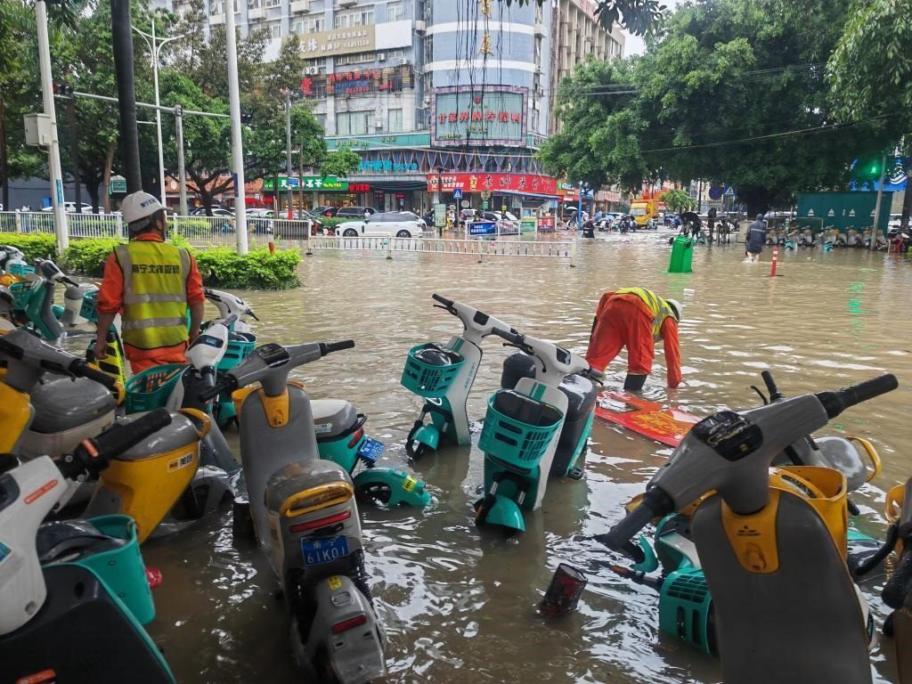 受暴雨影響,南寧市部分城區(qū)發(fā)生內(nèi)澇,一些低洼地帶積水較深。記者在南寧市青秀區(qū)東葛路一帶看到,一些地方積水深度為0.5米左右,不少電動自行車側(cè)倒在馬路兩邊,有數(shù)輛小汽車熄火停在路中間。一名群眾告訴記者,19日凌晨3時(shí)左右突降暴雨,大量雨水灌入地勢較低的地下車庫,一些來不及轉(zhuǎn)移的車輛被淹。