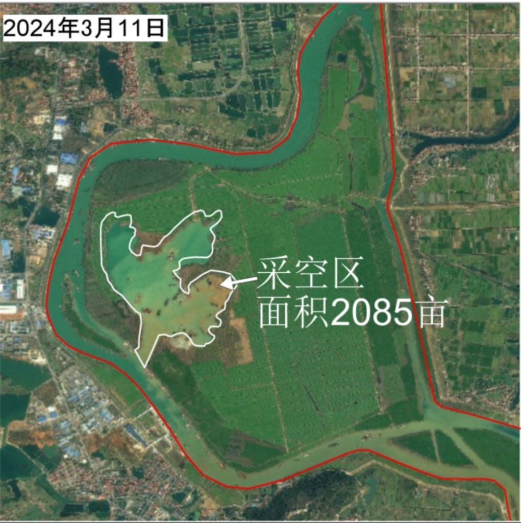 督察組查詢衛(wèi)星影像顯示,澧水河口濕地保護(hù)區(qū)孟姜垸洲灘被大面積采挖。(督察組供圖)