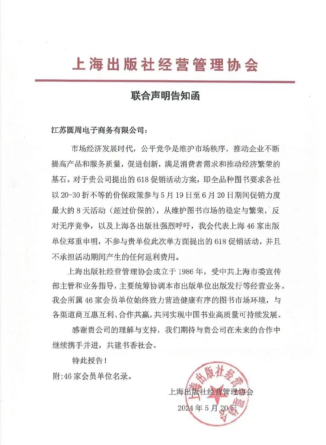 上海的46家出版社以上海出版社經(jīng)營(yíng)管理協(xié)會(huì)的名義聯(lián)合聲明退出京東618促銷
