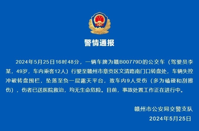 央視網(wǎng)消息:據(jù)贛州公安微信公眾號消息,2024年5月25日16時48分,一輛車牌為贛B00779D的公交車(駕駛員李某,49歲,車內(nèi)乘客12人)行駛至贛州市章貢區(qū)文清路南門口轉(zhuǎn)盤處,車輛失控沖破轉(zhuǎn)盤圍欄,墜落至負一層露天平臺,致車內(nèi)9人受傷(多為磕碰和刮擦傷),傷者已送醫(yī)院救治,均無生命危險。目前,事故處置工作正在進行中。