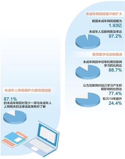 《報告》顯示,未成年人網(wǎng)絡保護力度持續(xù)加強,網(wǎng)絡安全環(huán)境明顯改善。87.1%的未成年網(wǎng)民對至少一項與未成年人上網(wǎng)相關的法律或政策有所了解。