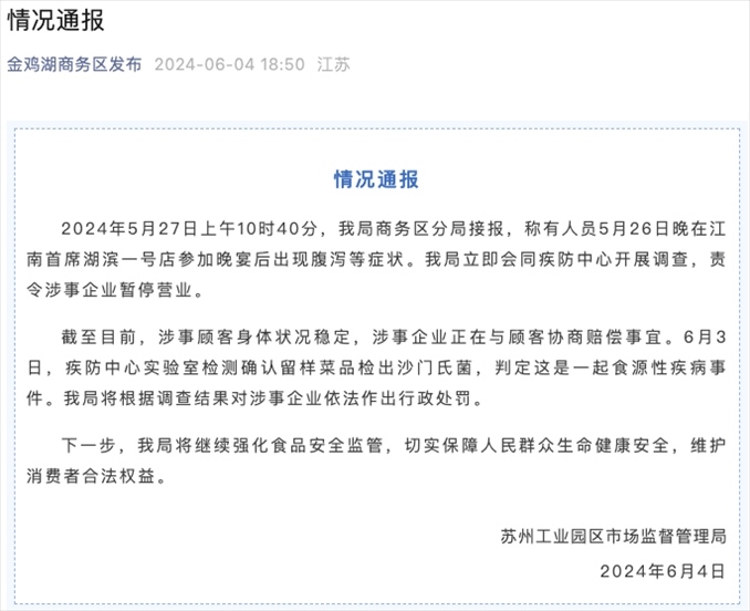 央視網(wǎng)消息:據(jù)蘇州工業(yè)園區(qū)市場監(jiān)督管理局通報,5月27日上午10時40分,商務(wù)區(qū)分局接報,稱有人員5月26日晚在江南首席湖濱一號店參加晚宴后出現(xiàn)腹瀉等癥狀。該局立即會同疾防中心開展調(diào)查,責(zé)令涉事企業(yè)暫停營業(yè)。