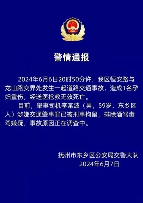 ·江西警方通報一起致孕婦身亡交通事故:肇事司機(jī)被刑事拘留。