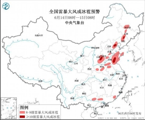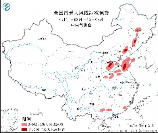 預(yù)計(jì)6月14日08時(shí)至15日08時(shí),黑龍江南部、吉林中西部、遼寧西部和北部、山西東南部、河北南部和東北部、山東中東部和南部、河南中北部和東部、安徽北部、江蘇北部等地的部分地區(qū)將有8級(jí)以上雷暴大風(fēng)或冰雹天氣,其中,遼寧北部和西部、山西東南部、河北南部和東北部、山東中南部等地的局地將有10級(jí)以上雷暴大風(fēng),最大風(fēng)力可達(dá)11級(jí)以上;渤海部分海域、萊州灣、山東半島附近海域?qū)⒂?~10級(jí)的雷暴大風(fēng)。黑龍江南部和中東部、吉林南部和西北部、遼寧中東部和西南部、河北東北部、山東中東部和南部等地的部分地區(qū)將有小時(shí)雨量大于20毫米的短時(shí)強(qiáng)降水天氣,其中,黑龍江中部、山東中南部等地的局地小時(shí)雨量大于50毫米,最大可達(dá)80毫米以上。預(yù)計(jì),強(qiáng)對(duì)流的主要影響時(shí)段為今天午后至夜間。中央氣象臺(tái)6月14日06時(shí)發(fā)布強(qiáng)對(duì)流天氣藍(lán)色預(yù)警(見(jiàn)圖2)。