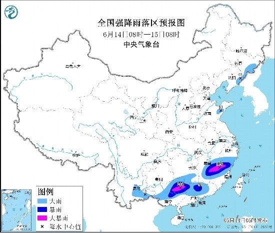 預(yù)計(jì),6月14日08時(shí)至15日08時(shí),江西中東部、浙江南部、福建西部和北部、湖南南部、云南東南部、廣西中北部、廣東中北部以及吉林東部、遼寧東北部、山東南部等地部分地區(qū)有大到暴雨,其中,江西東部、福建西北部、廣西東北部等地部分地區(qū)有大暴雨(100~200毫米)。上述部分地區(qū)伴有短時(shí)強(qiáng)降水(最大小時(shí)降雨量30~50毫米,局地可超過(guò)80毫米),局地有雷暴大風(fēng)或冰雹等強(qiáng)對(duì)流天氣。中央氣象臺(tái)6月14日06時(shí)發(fā)布暴雨黃色預(yù)警(見(jiàn)圖1)。