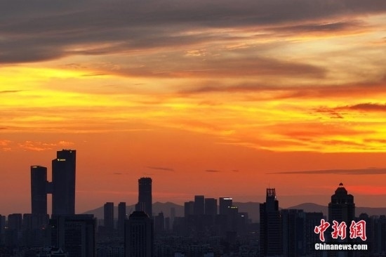 7月7日傍晚,南京上空漫天紅霞。近日,當(dāng)?shù)爻掷m(xù)高溫,同時(shí)“蒸”出晴好天氣。(無人機(jī)照片)