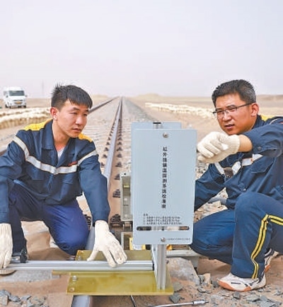 臺欣龍(右)和同事在對紅外線軸溫探測設(shè)備探頭進(jìn)行方位角矯正。