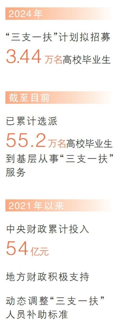 在奮斗中書寫青春華章,在奉獻中成就事業(yè)。2006年“三支一扶”計劃開展以來,50多萬名高校畢業(yè)生扎根鄉(xiāng)村,開展支教、支農(nóng)、支醫(yī)等服務。2024年,“三支一扶”計劃擬招募3.44萬名高校畢業(yè)生到基層開展相關(guān)服務。