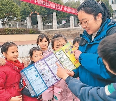 在湖南省江永縣實驗小學,該縣農(nóng)商銀行工作人員為小學生宣講網(wǎng)絡(luò)金融知識。潘百旺攝(人民視覺)