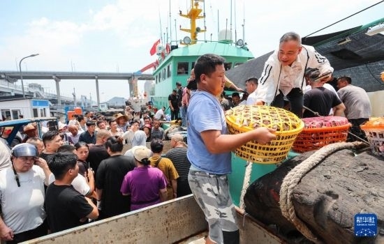 當(dāng)日,在浙江省舟山市普陀區(qū)舟山國際水產(chǎn)城碼頭,出海的漁船歸來,商戶們聞“鮮”而至。工人把卸下來的梭子蟹運(yùn)往水產(chǎn)城內(nèi),準(zhǔn)備銷往各地市場。