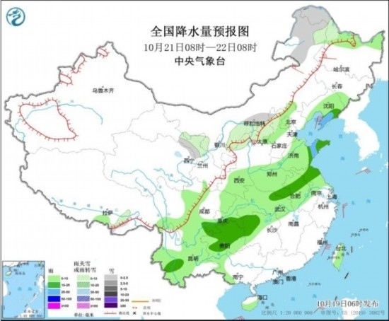 10月21日08時至22日08時,內(nèi)蒙古河套地區(qū)和東北部、黑龍江西北部、甘肅河西、寧夏北部、陜西北部、山西北部、河北北部等地部分地區(qū)有小雪或雨夾雪。黑龍江北部、吉林南部、遼寧大部、陜西北部、黃淮、江淮大部、江漢、江南北部、西南地區(qū)大部、廣西西北部、海南島南部、臺灣島大部等地部分地區(qū)有小到中雨,其中,遼寧東部和南部、山東半島等地部分地區(qū)有大雨。內(nèi)蒙古中部、黑龍江西南部等地部分地區(qū)有5~6級風。