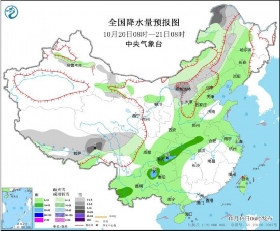 全國降水量預報圖(10月19日08時-20日08時)。圖片來源:中央氣象臺網(wǎng)站