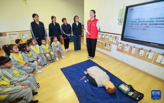 10月22日,國網(wǎng)浙江湖州供電公司“救”在身邊志愿服務(wù)隊的黨員志愿者梅月圓(右一)在長興縣開發(fā)區(qū)中心幼兒園開展應急救護培訓和急救知識普及。紅十字二級應急救護師梅月圓是應急救護培訓志愿者,也是浙江省三八紅旗手。