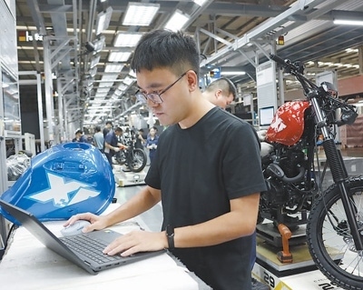 “哪個(gè)環(huán)節(jié)的裝配參數(shù)和給定值不吻合,系統(tǒng)就會(huì)自動(dòng)報(bào)警,不再需要人工巡檢,效率得到大幅提升。”陳國(guó)靖說(shuō),得益于數(shù)智化生產(chǎn)線,每150秒就有一輛摩托車(chē)下線。