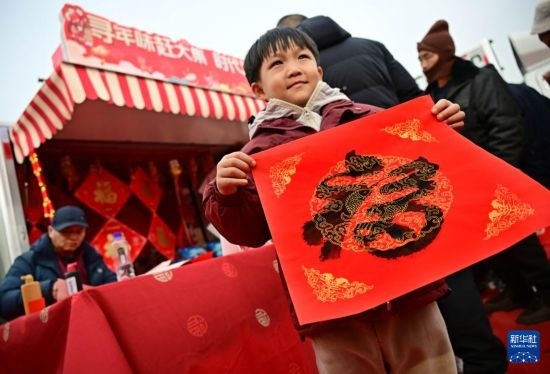 1月18日,一名小男孩在泊里大集非遺互動(dòng)區(qū)領(lǐng)取福字。