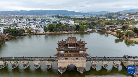 2月3日,游客在云南省建水縣雙龍橋游覽(無人機(jī)照片)。