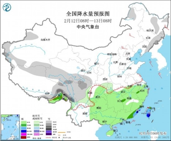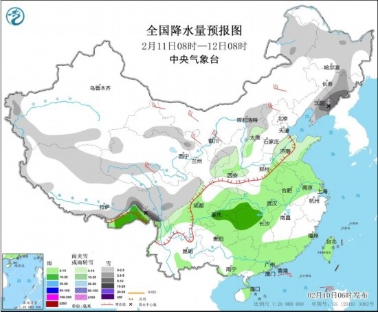 全國降水量預報圖(2月10日08時-11日08時) 圖片來源:中央氣象臺網(wǎng)站