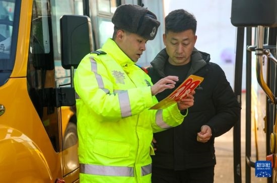 2月14日,烏魯木齊市公安局交警支隊(duì)水磨溝區(qū)大隊(duì)民警檢查校車通行證。