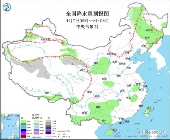 4月7日08時至8日08時,新疆南疆西部和南部山區(qū)、內蒙古東北部、黑龍江中北部、西藏西北部、青海北部等地部分地區(qū)有小雪或雨夾雪。新疆伊犁河谷、寧夏、陜西北部、黑龍江南部、吉林、云南南部、貴州中南部、廣西大部、湖南中西部、安徽南部、海南島、臺灣島等地部分地區(qū)有小雨,局地有中雨。內蒙古大部、西藏北部、甘肅河西、川西高原北部等地部分地區(qū)有4~6級風,陣風7級。
