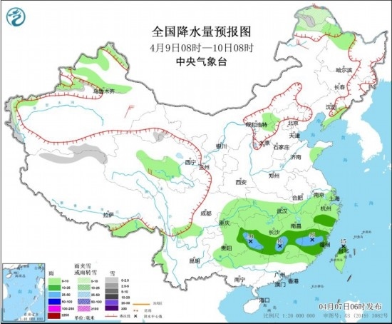 4月9日08時至10日08時,內蒙古東部、新疆南疆西部山區(qū)有小到中雪或雨夾雪,貴州東部、湖南中南部、江西中南部、浙江南部、福建、臺灣島中北部等地有中到大雨(25~45毫米)。內蒙古中部和東部、陜西中北部、山西部分地區(qū)有4~6級風,陣風7級。