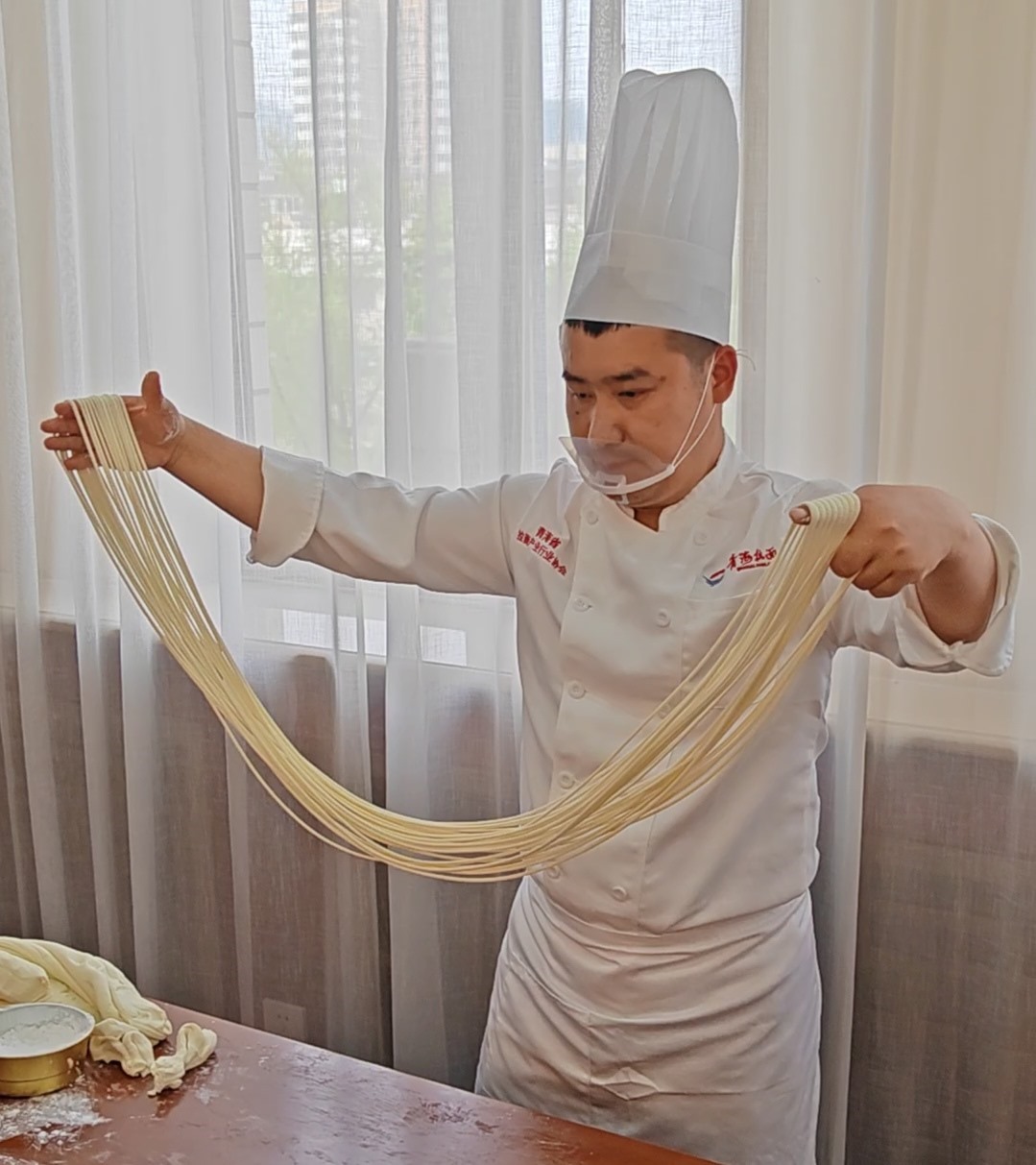 來(lái)自青海省本地的拉面師傅還在現(xiàn)場(chǎng)展示了拉面技術(shù)。據(jù)了解,拉面是4000多年來(lái)中華民族對(duì)美食的探索和傳承的結(jié)晶。2002年,在青海省海東市民和回族土族自治縣的喇家遺址中發(fā)現(xiàn)了距今4000多年前的一根面條,是迄今為止發(fā)現(xiàn)的世界上最古老的面條,被稱(chēng)作“世界第一面”,也說(shuō)明中國(guó)是面條的發(fā)源地。