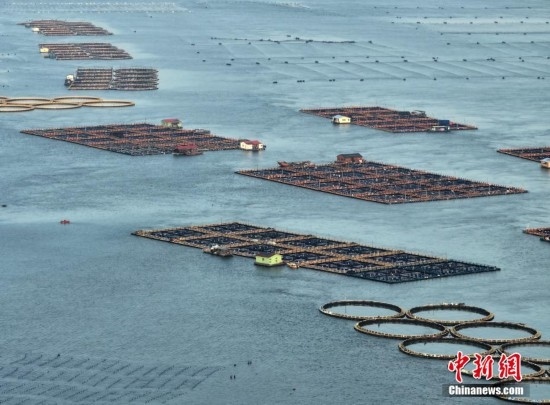 5月2日,福建福州福清市沙埔鎮(zhèn)養(yǎng)殖海域,養(yǎng)殖網(wǎng)箱漂浮在海面上,海上風(fēng)車依次排開,蔚為壯觀。(無(wú)人機(jī)照片)