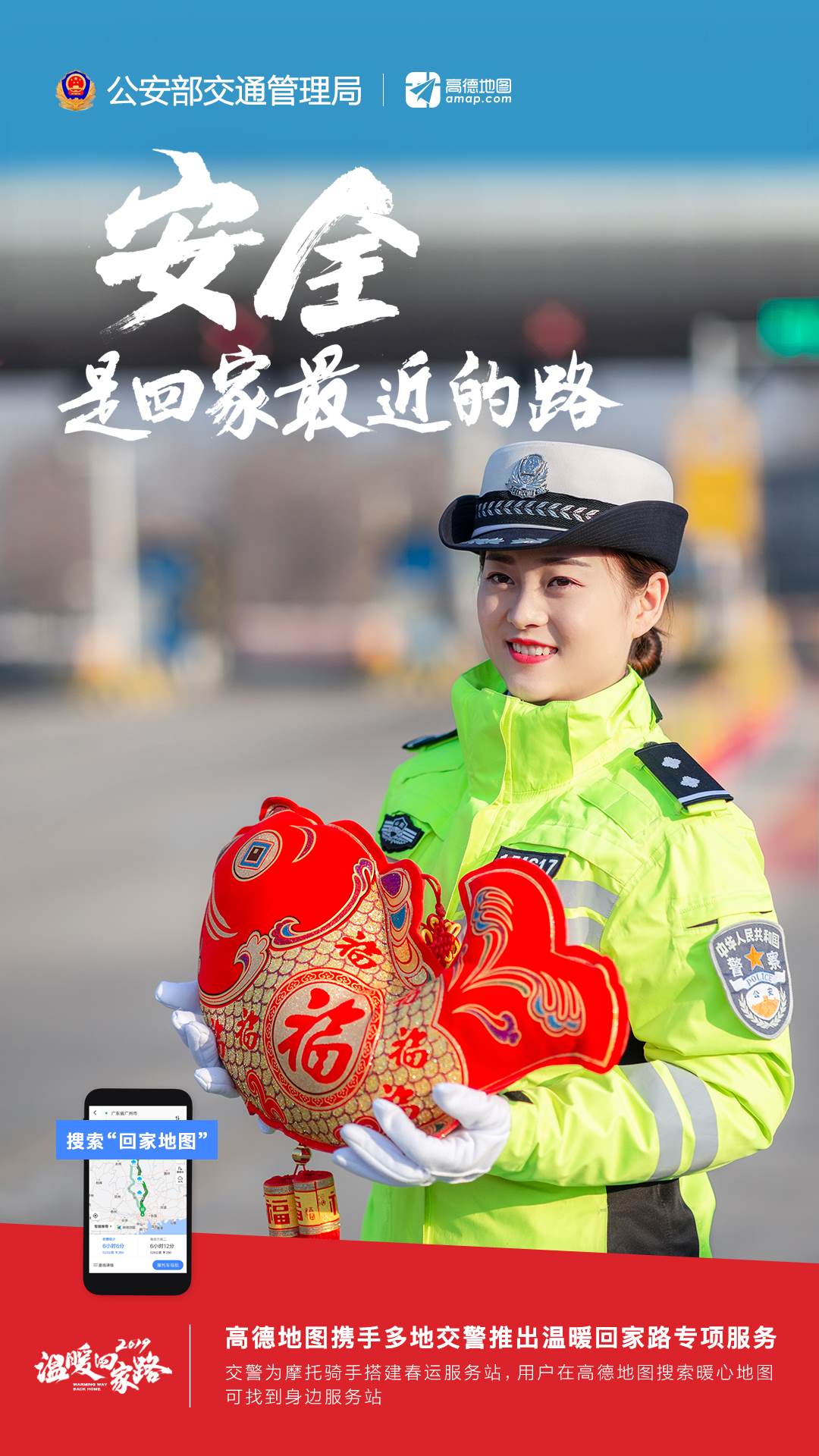 為做好2019年春運(yùn)保障工作,特別是發(fā)動(dòng)社會(huì)力量做好交通安全社會(huì)協(xié)同治理,廣東、廣西、福建、江西、湖北、云南、安徽、四川、湖南等春運(yùn)重點(diǎn)省、自治區(qū)交警總隊(duì)聯(lián)合高德地圖啟動(dòng)2019年春運(yùn)“溫暖回家路”專項(xiàng),推出“回家地圖”系列在線服務(wù),通過“交警+科技”結(jié)合,助力人民群眾安全返鄉(xiāng)。同時(shí),與人民日?qǐng)?bào)社、新華社、中央廣播電視總臺(tái)等媒體,以及中廣聯(lián)合會(huì)、中國交通頻道等機(jī)構(gòu)和微博、秒拍、一直播等新媒體平臺(tái)聯(lián)動(dòng),共同開展2019年春運(yùn)交通安全宣傳工作。