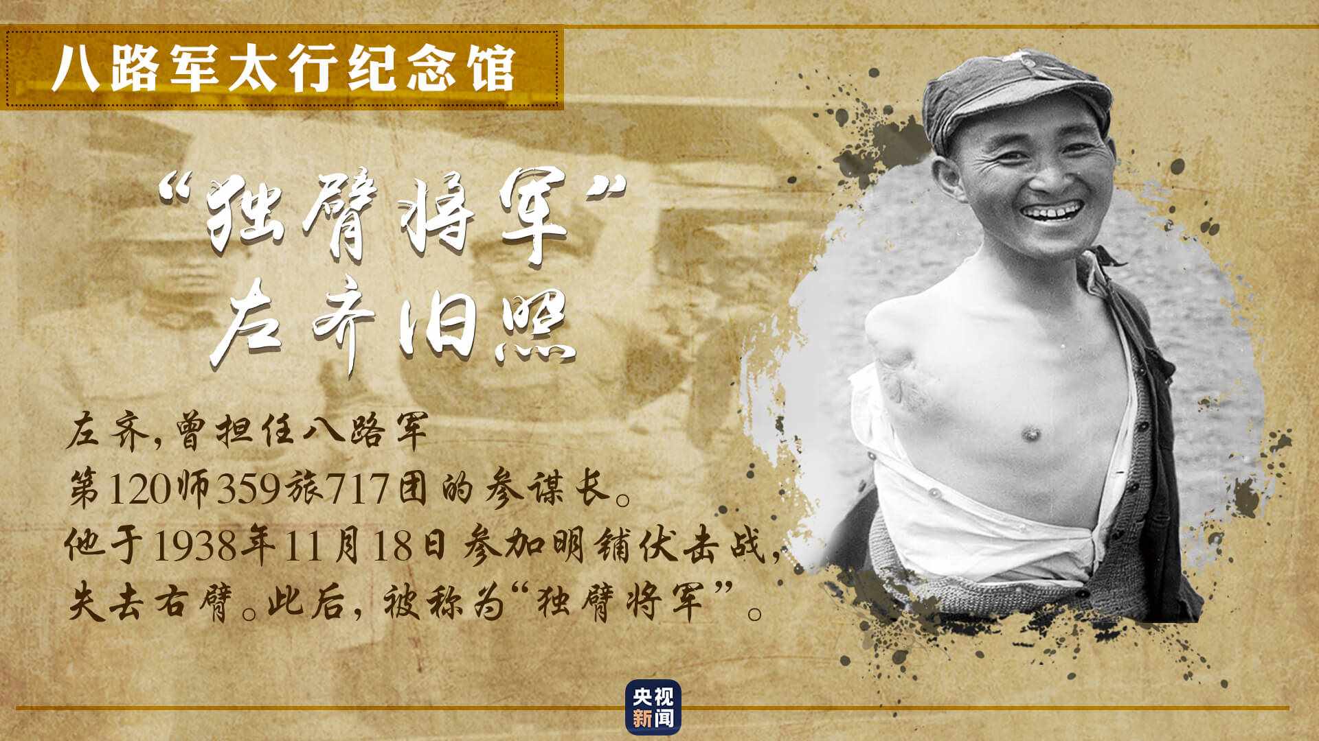 一張獨(dú)臂將軍的舊照,展現(xiàn)出八路軍為爭取民族獨(dú)立,不怕犧牲、不畏艱險的革命英雄主義精神。
