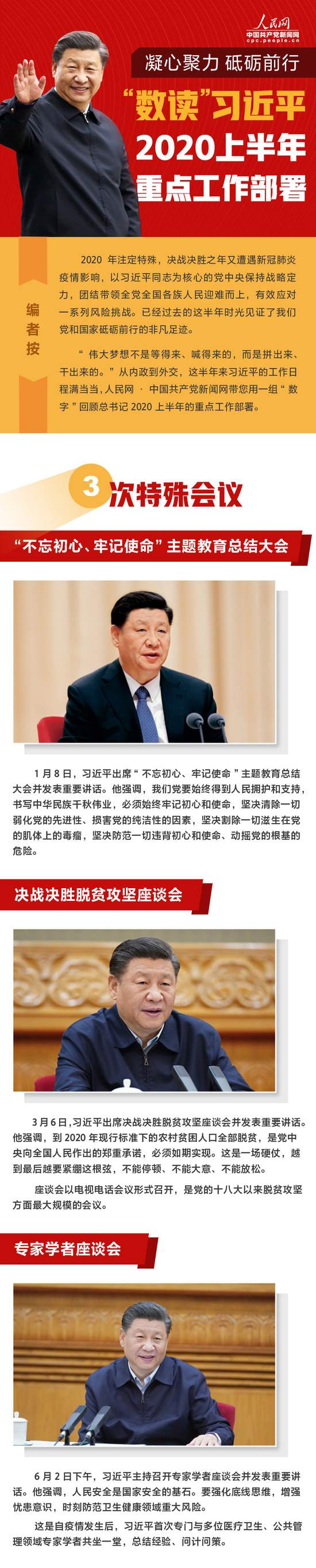 細數(shù)今年上半年,習(xí)近平夙夜在公,勤勉工作,不斷刷新“忙碌指數(shù)”:數(shù)十次出席重要會議部署各項工作,8次國內(nèi)考察,調(diào)研足跡遍及7省區(qū)市,3次出席國際重要會議并發(fā)表講話,20余次致信、回信海內(nèi)外人士,60次就疫情防控等話題與40余位外國政要和國際組織負責(zé)人通電話……人民網(wǎng)·中國共產(chǎn)黨新聞網(wǎng)推出系列圖解報道,帶您全方面回顧習(xí)近平的2020上半年。