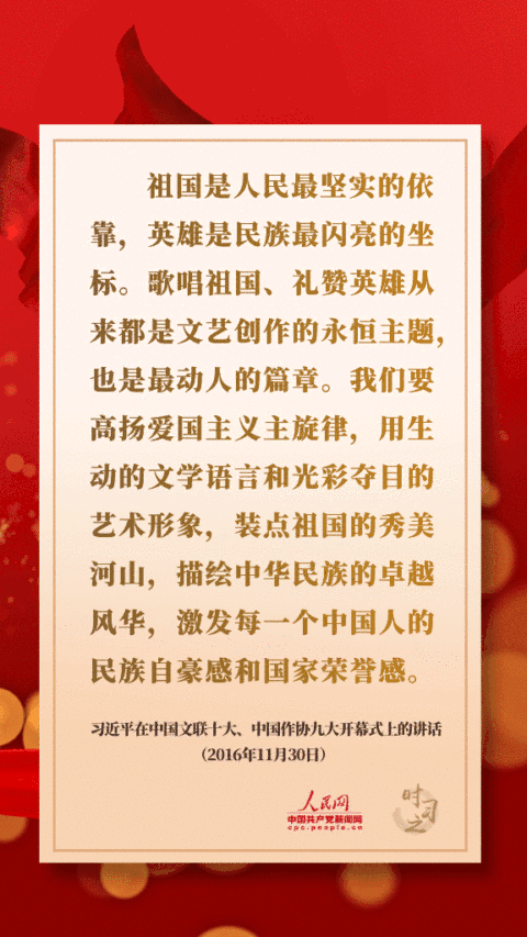 祖國是人民最堅實的依靠,英雄是民族最閃亮的坐標(biāo)。歌唱祖國、禮贊英雄從來都是文藝創(chuàng)作的永恒主題,也是最動人的篇章。我們要高揚(yáng)愛國主義主旋律,用生動的文學(xué)語言和光彩奪目的藝術(shù)形象,裝點祖國的秀美河山,描繪中華民族的卓越風(fēng)華,激發(fā)每一個中國人的民族自豪感和國家榮譽(yù)感。