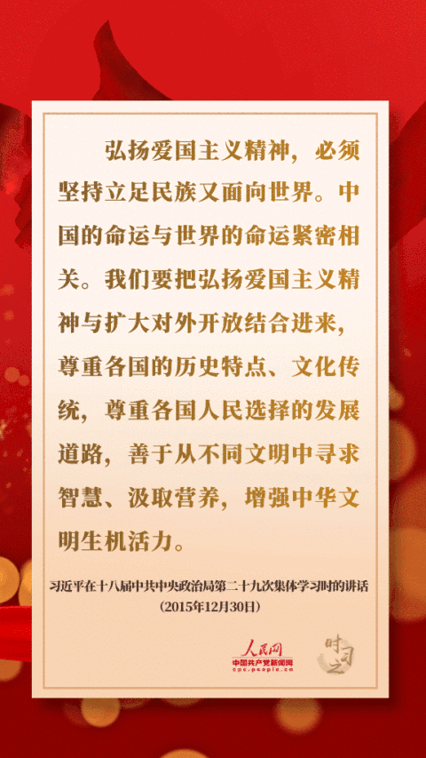 弘揚(yáng)愛國主義精神,必須堅持立足民族又面向世界。中國的命運(yùn)與世界的命運(yùn)緊密相關(guān)。我們要把弘揚(yáng)愛國主義精神與擴(kuò)大對外開放結(jié)合進(jìn)來,尊重各國的歷史特點、文化傳統(tǒng),尊重各國人民選擇的發(fā)展道路,善于從不同文明中尋求智慧、汲取營養(yǎng),增強(qiáng)中華文明生機(jī)活力。