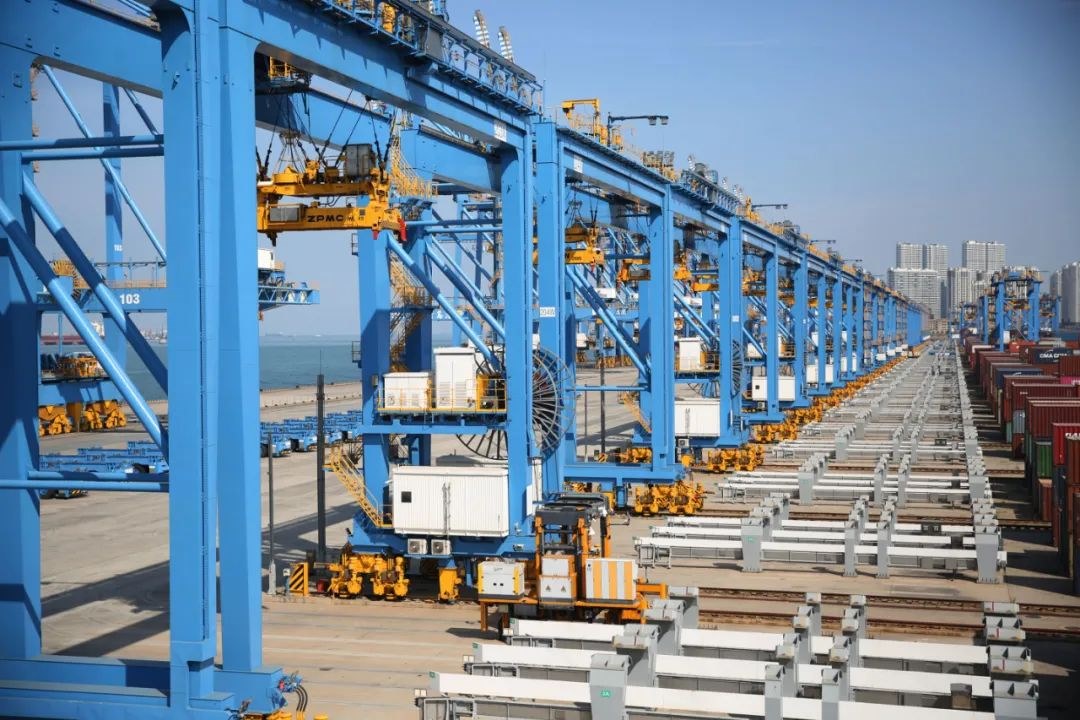 △10月8日,位于山東自貿(mào)區(qū)青島片區(qū)的山東港口青島港全自動化碼頭集裝箱堆場一派繁忙景象。