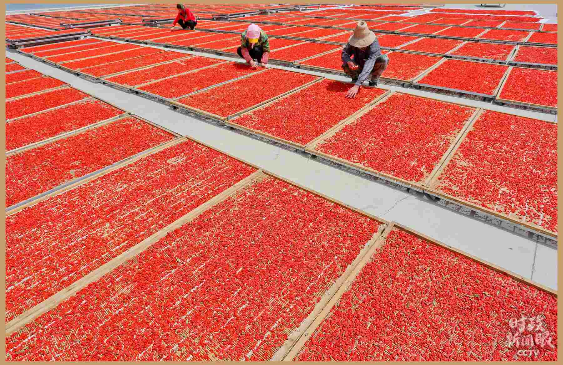 △甘肅張掖苗家堡村“扶貧車(chē)間”里,農(nóng)戶在晾曬枸杞。