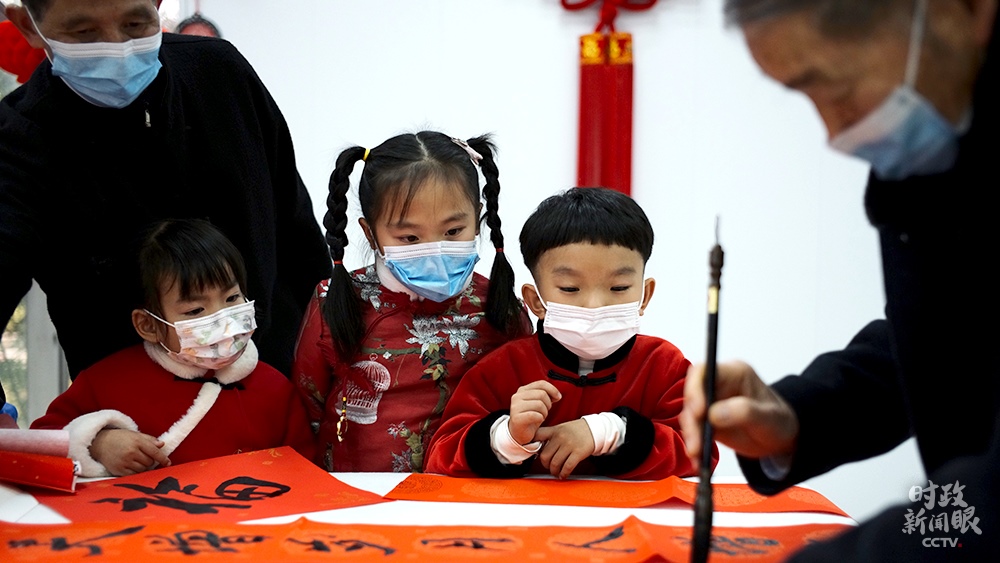 △金元社區(qū)居民活動室內(nèi),孩子們觀摩書法寫作。(總臺央視記者王哈男拍攝)