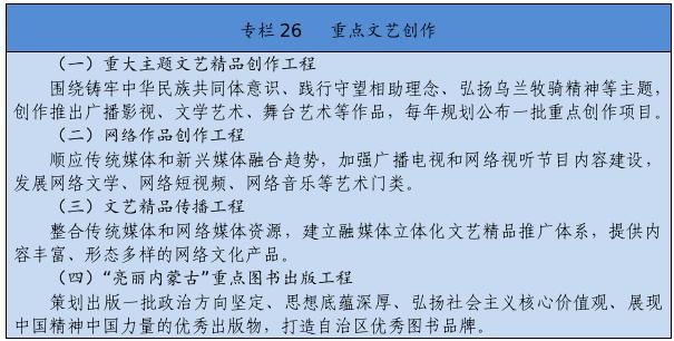 堅持以人民為中心的創(chuàng)作導(dǎo)向,創(chuàng)作生產(chǎn)出人民喜聞樂見的優(yōu)秀作品。繁榮發(fā)展新聞出版、廣播影視、文學(xué)藝術(shù),實施文藝作品質(zhì)量提升工程,加強(qiáng)優(yōu)秀劇本孵化和生活采風(fēng)。推動重大主題文藝精品創(chuàng)作,加強(qiáng)現(xiàn)實題材創(chuàng)作生產(chǎn)。改進(jìn)重點(diǎn)作品創(chuàng)作引導(dǎo)機(jī)制,建立重點(diǎn)文化藝術(shù)項目滾動扶持機(jī)制。設(shè)立內(nèi)蒙古文化藝術(shù)發(fā)展專項資金。加強(qiáng)文化文藝場館建設(shè)。制定文藝人才發(fā)展規(guī)劃,開展內(nèi)蒙古電影新導(dǎo)演計劃。實施文化潤心工程,以文藝創(chuàng)作鑄牢中華民族共同體意識。提升廣播電視和網(wǎng)絡(luò)視聽產(chǎn)品質(zhì)量,豐富網(wǎng)絡(luò)文藝內(nèi)容。搭建文藝精品遴選、展示、推出平臺,建設(shè)內(nèi)蒙古音樂廳,支持因地制宜建設(shè)綜合劇場、音樂廳和美術(shù)館,舉辦內(nèi)蒙古藝術(shù)節(jié)、內(nèi)蒙古音樂節(jié)等活動,大力實施文藝惠民演出和地方戲傳承創(chuàng)新工程,定期舉辦全區(qū)地方戲優(yōu)秀劇目展演以及音樂、舞蹈、小戲小品專業(yè)賽事,打造獨(dú)具特色的文化藝術(shù)品牌。