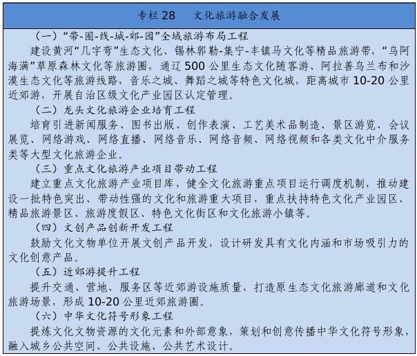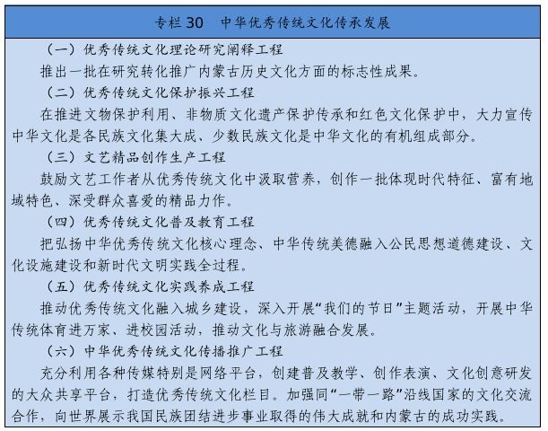 建立健全把社會效益放在首位、社會效益和經(jīng)濟(jì)效益相統(tǒng)一的文化創(chuàng)作生產(chǎn)體制機(jī)制。完善文化管理體制和生產(chǎn)經(jīng)營機(jī)制。健全現(xiàn)代文化產(chǎn)業(yè)體系和市場體系。完善文化和旅游融合發(fā)展體制機(jī)制。推進(jìn)內(nèi)蒙古藝術(shù)劇院等國有文藝院團(tuán)和烏蘭牧騎改革。完善文化企業(yè)履行社會責(zé)任制度,健全引導(dǎo)新型文化業(yè)態(tài)健康發(fā)展機(jī)制。深化國有文化企業(yè)改革,加快重組整合、結(jié)構(gòu)調(diào)整、多元化發(fā)展。健全文物保護(hù)利用法律制度和標(biāo)準(zhǔn)規(guī)范。設(shè)立文化產(chǎn)業(yè)發(fā)展專項資金。