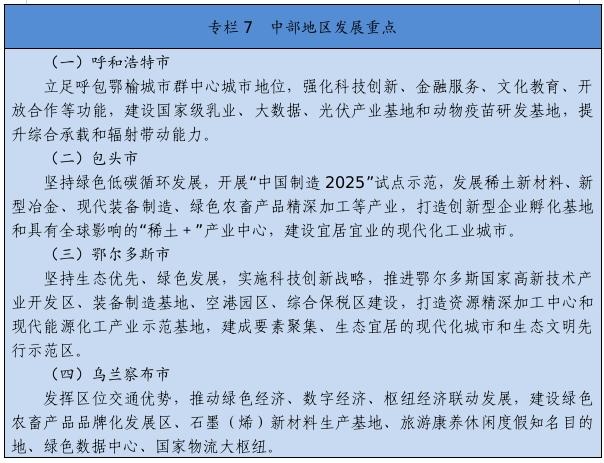 高標(biāo)準(zhǔn)打造稀土新材料、乳業(yè)國家技術(shù)創(chuàng)新中心,在優(yōu)勢特色產(chǎn)業(yè)領(lǐng)域培育一批國家重點(diǎn)實驗室,布局建設(shè)自治區(qū)重點(diǎn)實驗室、工程研究中心、產(chǎn)業(yè)創(chuàng)新中心、技術(shù)創(chuàng)新中心,構(gòu)建形成創(chuàng)新平臺體系。高質(zhì)量建設(shè)呼包鄂國家自主創(chuàng)新示范區(qū)、鄂爾多斯國家可持續(xù)發(fā)展議程創(chuàng)新示范區(qū)和巴彥淖爾國家農(nóng)業(yè)高新技術(shù)產(chǎn)業(yè)示范區(qū)。重點(diǎn)實施國家級高新區(qū)“提質(zhì)進(jìn)位”行動,爭取包頭稀土、呼和浩特金山、鄂爾多斯三個國家級高新技術(shù)產(chǎn)業(yè)開發(fā)區(qū)在全國高新技術(shù)開發(fā)區(qū)排名晉升5個位次。開展自治區(qū)級高新區(qū)“促優(yōu)培育”行動,推動赤峰、阿拉善、通遼高新區(qū)升級國家級高新區(qū),打造若干創(chuàng)新資源集聚高地。高質(zhì)量推進(jìn)“科創(chuàng)中國”試點(diǎn)城市建設(shè),大力實施科技創(chuàng)新賦能行動,促進(jìn)科技經(jīng)濟(jì)深度融合。