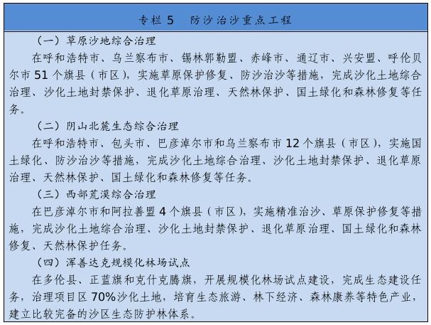 繼續(xù)實施京津風(fēng)沙源治理等重點(diǎn)工程,推廣庫布其沙漠治理方式和沙產(chǎn)業(yè)模式,推動渾善達(dá)克、烏珠穆沁、呼倫貝爾沙地治理。推進(jìn)規(guī)?;謭鼋ㄔO(shè),采取人工造林、封沙育林、飛播造林等方式恢復(fù)植被。建設(shè)荒漠綠洲防護(hù)林、防風(fēng)固沙林、沙漠鎖邊林、農(nóng)田草牧場防護(hù)林以及水土保持林。以干旱半干旱草原為重點(diǎn),加強(qiáng)草場改良和人工種草,實行圍封禁牧、劃區(qū)輪牧、季節(jié)性休牧、舍飼圈養(yǎng)等措施,保護(hù)和恢復(fù)草原植被。以內(nèi)蒙古高原等為重點(diǎn),推進(jìn)防護(hù)林體系建設(shè)及退化林修復(fù)、退化草原修復(fù)、京津風(fēng)沙源治理。新增水土流失綜合治理3.33萬平方公里。
