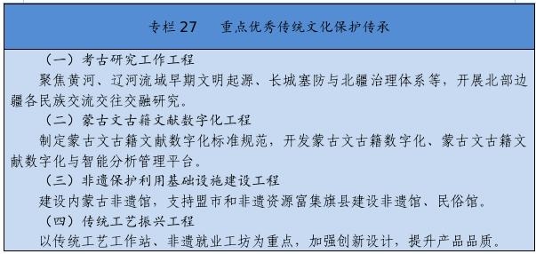 實施文化遺產(chǎn)系統(tǒng)性保護(hù)工程,強(qiáng)化重要文化和自然遺產(chǎn)、非物質(zhì)文化遺產(chǎn)系統(tǒng)性保護(hù),建立整體保護(hù)、活態(tài)傳承、創(chuàng)新發(fā)展體系。實施重大文物保護(hù)工程,推進(jìn)長城、黃河國家文化公園和大窯、遼上京、和林格爾土城子等國家考古遺址公園建設(shè)。推動萬里茶道(內(nèi)蒙古段)、遼上京和祖陵遺址、紅山遺址群和陰山巖刻申遺。加強(qiáng)阿爾寨石窟寺等石窟文物保護(hù)。開展“中華文明探源”工程、“考古中國”河套地區(qū)早期聚落遺址考古發(fā)掘研究。建設(shè)內(nèi)蒙古非遺博覽園、內(nèi)蒙古黃河文化博物館、內(nèi)蒙古工業(yè)博物館。加強(qiáng)紀(jì)念館、展覽館、博物館建設(shè)管理。推進(jìn)民族優(yōu)秀傳統(tǒng)手工藝保護(hù)傳承和振興,完善非遺名錄體系。實施中華傳統(tǒng)節(jié)日振興工程,開展傳統(tǒng)節(jié)日禮儀禮節(jié)教育活動。