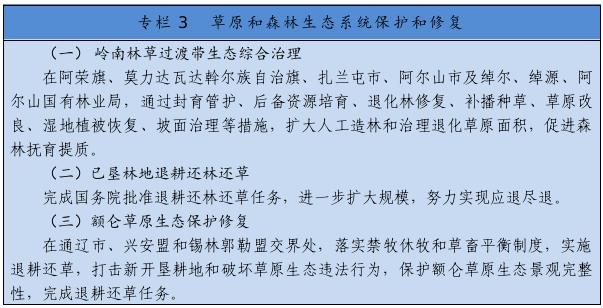 把保護(hù)草原、森林作為首要任務(wù),嚴(yán)格執(zhí)行基本草原保護(hù)制度,落實草原生態(tài)保護(hù)補(bǔ)助獎勵政策,完善草畜平衡和草原禁牧休牧制度。嚴(yán)禁在草原上亂采濫挖、新上礦產(chǎn)資源開發(fā)等工業(yè)項目,已批準(zhǔn)在建運(yùn)營的礦山、風(fēng)電、光伏等項目到期退出,新建風(fēng)電、光伏電站重點(diǎn)布局在沙漠荒漠、采煤沉陷區(qū)、露天礦排土場,推廣“光伏+生態(tài)治理”基地建設(shè)模式。開展草原生態(tài)承載能力核定和草原生態(tài)系統(tǒng)健康評價,實施草原保護(hù)和修復(fù)重大工程??茖W(xué)開展大規(guī)模國土綠化行動,實施三北防護(hù)林體系建設(shè)、公益林保護(hù)、森林質(zhì)量精準(zhǔn)提升等工程,探索大興安嶺一體化保護(hù)模式,推進(jìn)已墾森林草原退耕還林還草,加強(qiáng)森林撫育和退化林修復(fù),提升生態(tài)系統(tǒng)質(zhì)量和穩(wěn)定性。加快構(gòu)建以國家公園為主體的自然保護(hù)地體系。