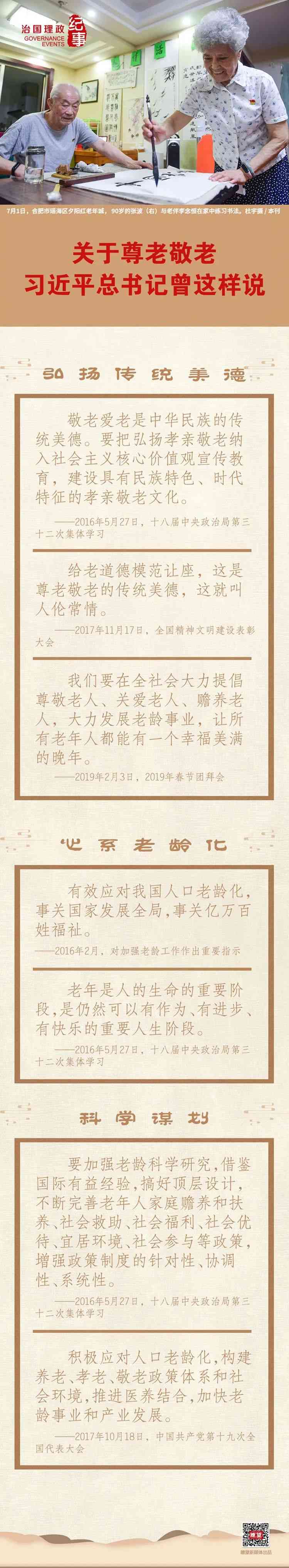 “古人講,‘夫孝,德之本也’。自古以來,中國人就提倡孝老愛親,倡導(dǎo)老吾老以及人之老、幼吾幼以及人之幼。我國已經(jīng)進(jìn)入老齡化社會(huì)。讓老年人老有所養(yǎng)、老有所依、老有所樂、老有所安,關(guān)系社會(huì)和諧穩(wěn)定。”2019年春節(jié)團(tuán)拜會(huì)上,習(xí)近平總書記這樣講述他心中的“孝”與尊老敬老傳統(tǒng)美德。