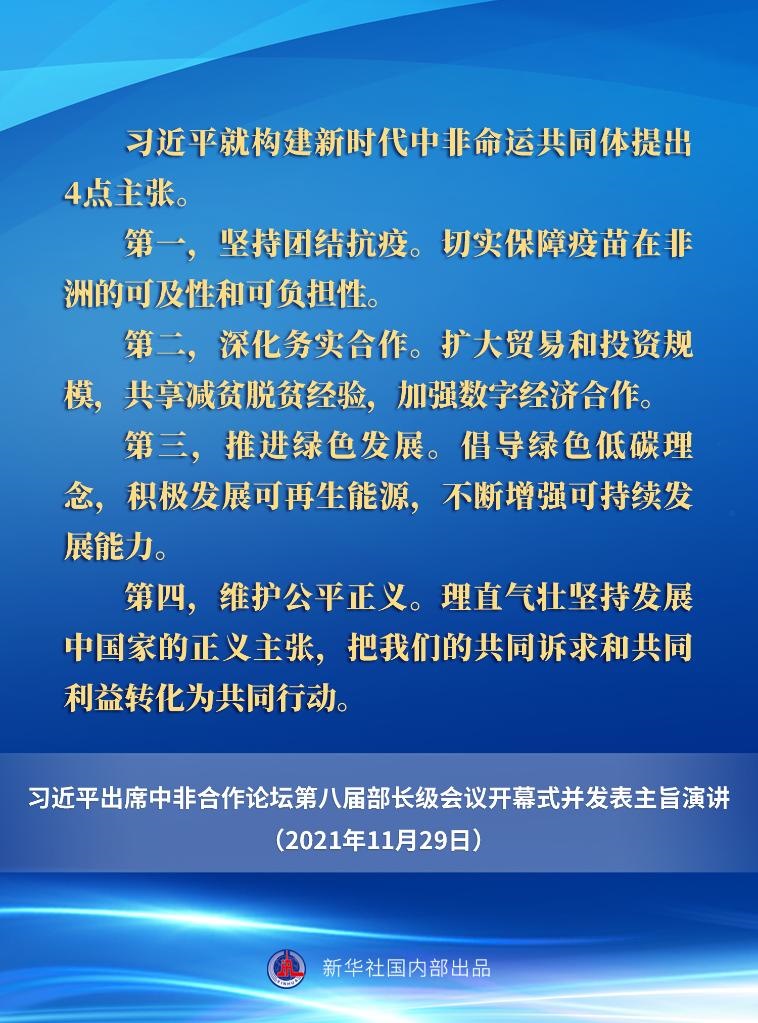 11月29日晚,國家主席習近平在北京以視頻方式出席中非合作論壇第八屆部長級會議開幕式并發(fā)表主旨演講。一起來看要點。
